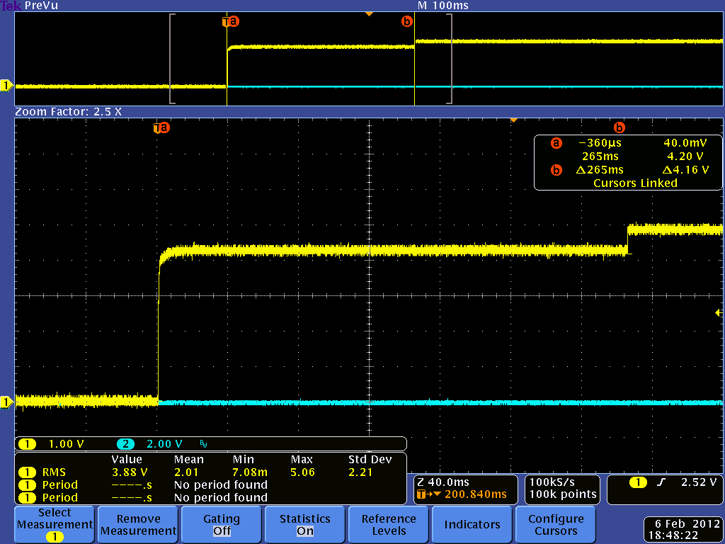 | current | 21:53, 6 February 2012 | 1,024 × 768 (27 KB) | Dirk (talk | contribs) | Oscillioscope trace of the 5V Switcher and LDO Regulator Output connected to a 50Ohm resistive load. |